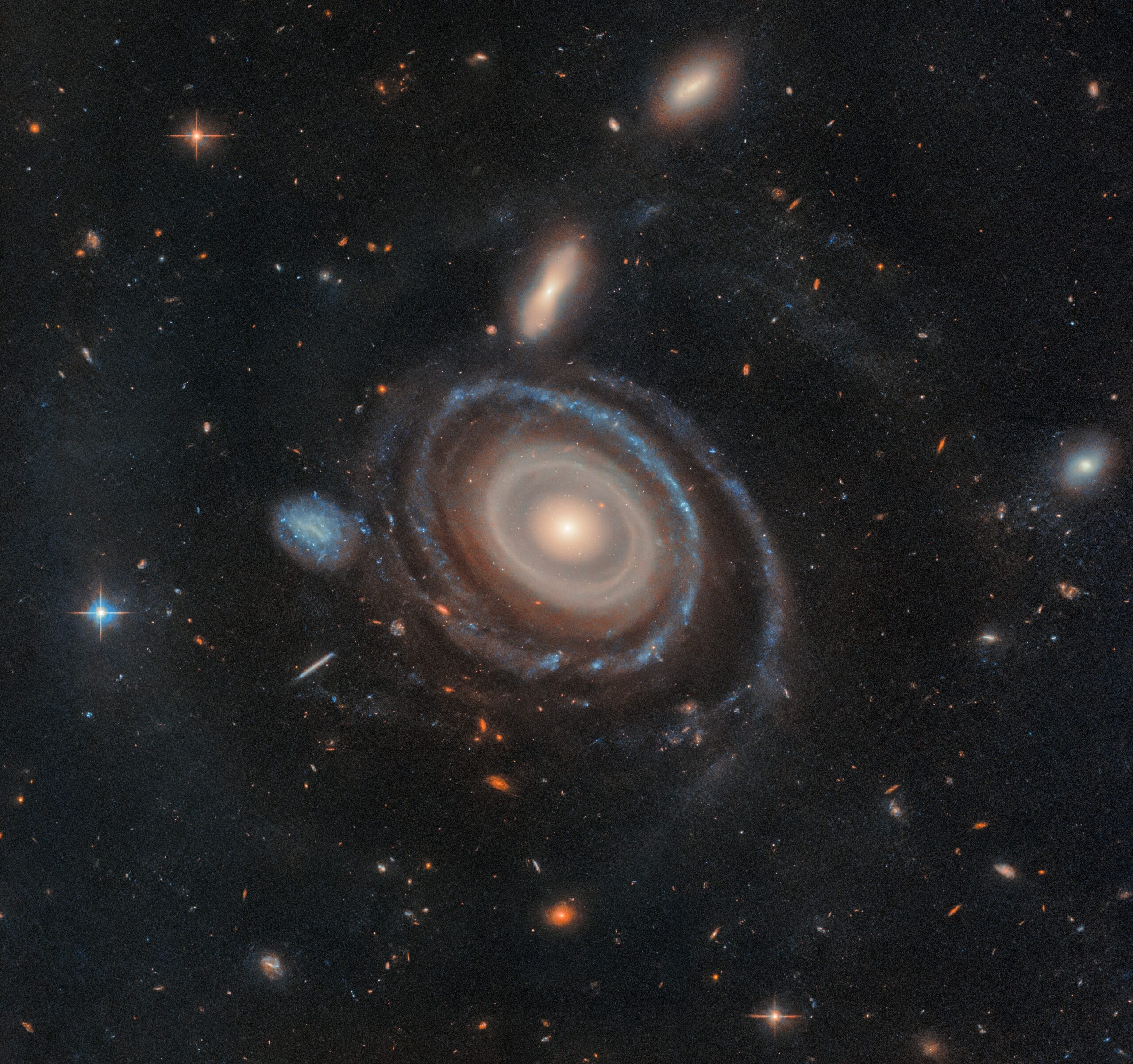 LEDA 1313424, acertadamente apodada Bullseye (el ojo de buey), tiene dos veces y media el tamaño de nuestra Vía Láctea y nueve anillos, seis más que cualquier otra galaxia conocida. Las imágenes de alta resolución del telescopio espacial Hubble de la NASA confirmaron ocho anillos, y los datos del Observatorio WM Keck en Hawai confirmaron un noveno. Hubble y Keck también confirmaron qué galaxia atravesó Bullseye, creando estos anillos: la galaxia enana azul que se encuentra justo en el centro a la izquierda.